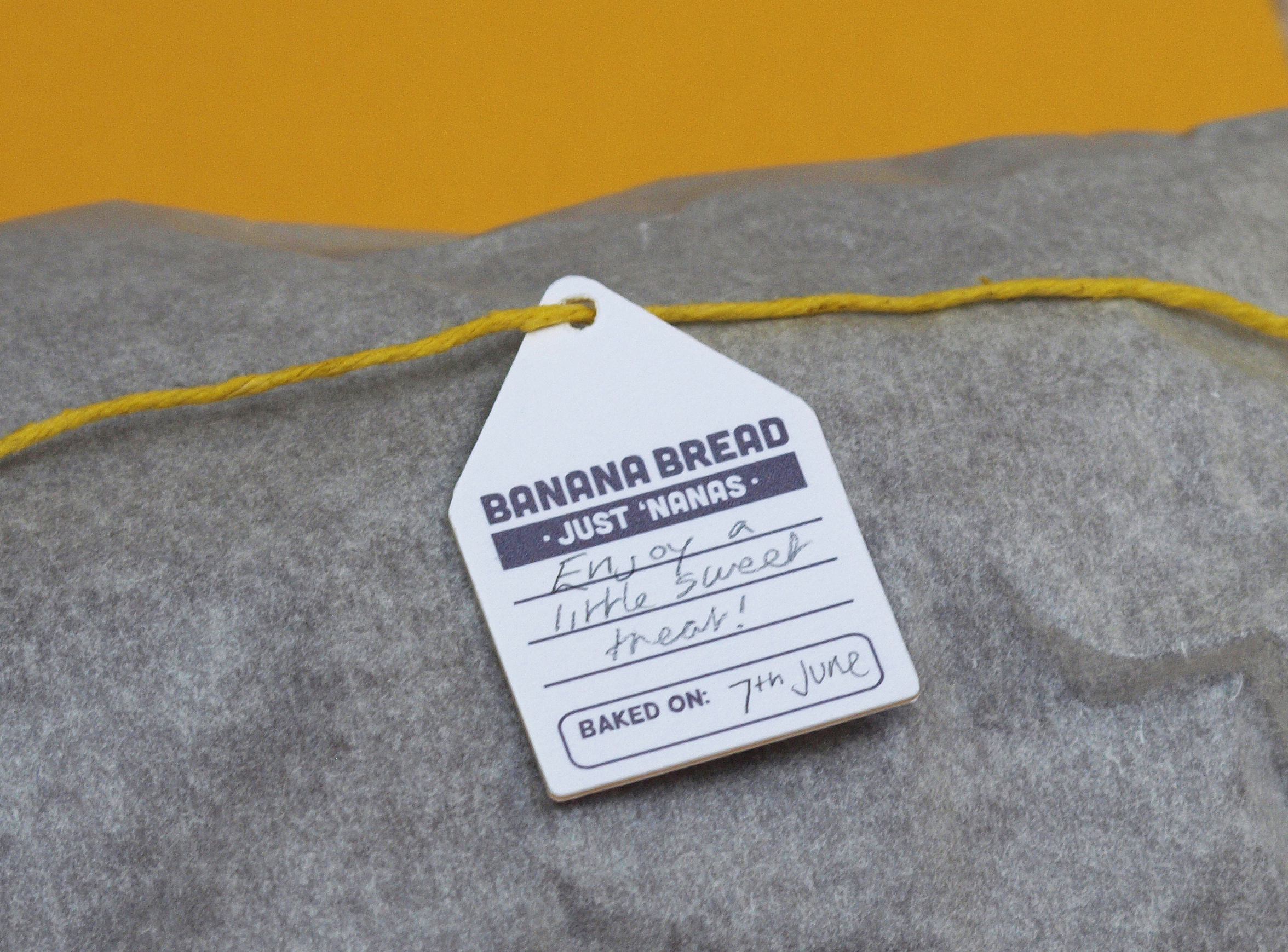 Solution | A little tag with space for a message from the baker. On the logo, different colour dots tell between each type of banana bread (choc-chip, coconut, plain).